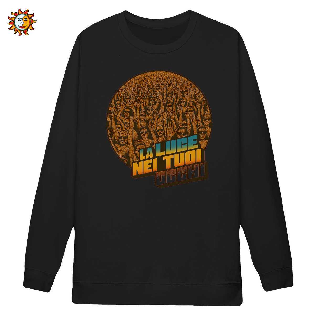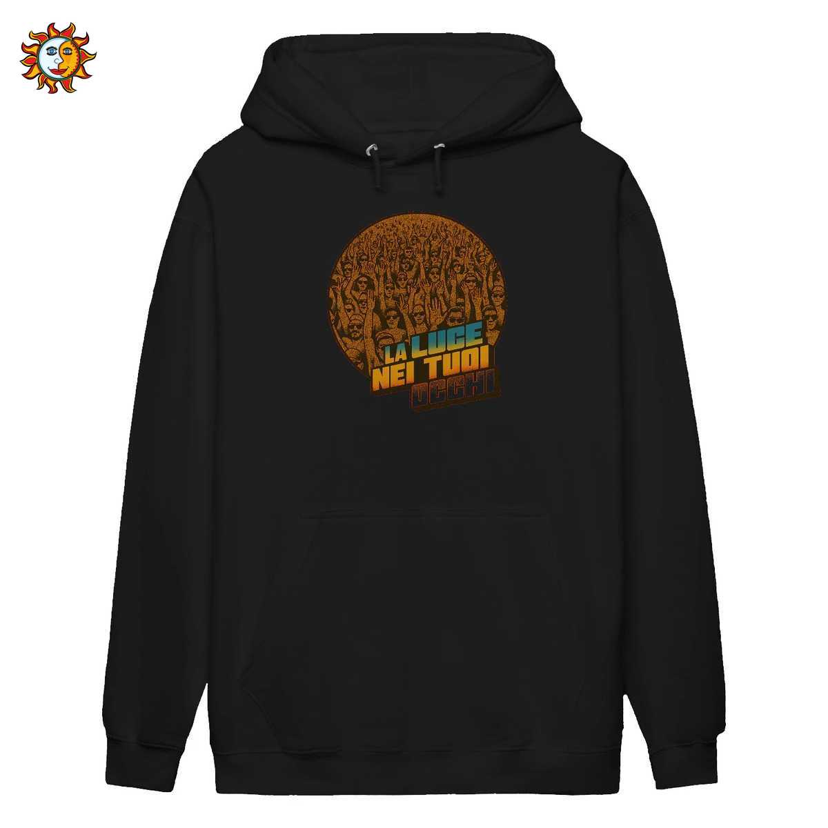 Questa non è una semplice maglietta, ma una dichiarazione d’amore per la musica italiana e per l’universo artistico di Lorenzo Cherubini. Il design è stato meticolosamente studiato per catturare l’atmosfera unica e irripetibile di un concerto di Jova. La grafica presenta un cerchio che racchiude una folla in festa, con le mani alzate verso il palco, un’immagine che ogni fan di Jova conosce bene. Le calde tonalità di arancione e giallo evocano l’energia del tramonto durante un Jova Beach Party o le luci di un palazzetto gremito. In primo piano, la frase iconica La Luce Nei Tuoi Occhi è scritta con un carattere audace e distintivo, con un gradiente di colore che sfuma dal blu all’arancione, simboleggiando la transizione dall’oscurità della notte all’energia del live. È il capo perfetto per mostrare la propria passione per uno dei più grandi cantanti italiani.