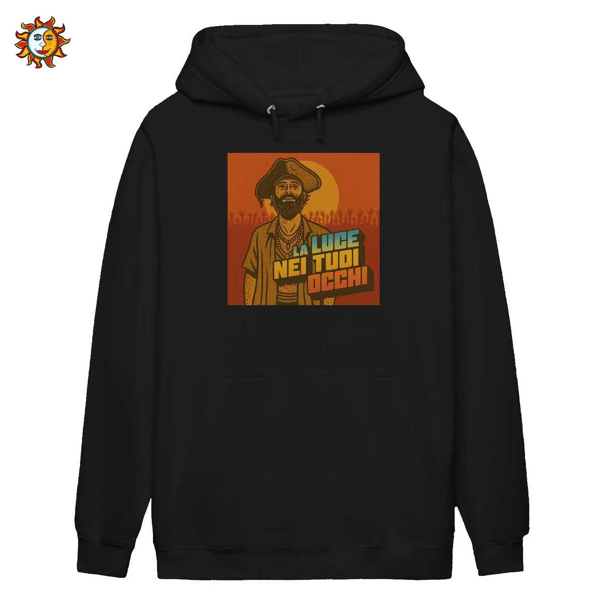 Ogni elemento del design ha un significato. Il ritratto di Lorenzo Cherubini, con barba e cappello, è un’immagine iconica che i fan riconoscono e amano. È il Jova esploratore, il cantastorie moderno. Lo sfondo è dominato dai colori caldi di un tramonto sulla spiaggia, un chiaro riferimento all’ambientazione del Jova Beach Party. Il sole che cala e la folla stilizzata in festa rappresentano quel momento magico in cui la musica unisce migliaia di persone in un unico coro. La frase ‘La Luce Nei Tuoi Occhi’, tratta da una delle sue canzoni più celebri, è il cuore emotivo del design. Stampata con un font audace e colorato, non è solo una citazione, ma un messaggio universale di speranza e connessione umana, temi centrali nel pop italiano e nella poetica di Jovanotti.