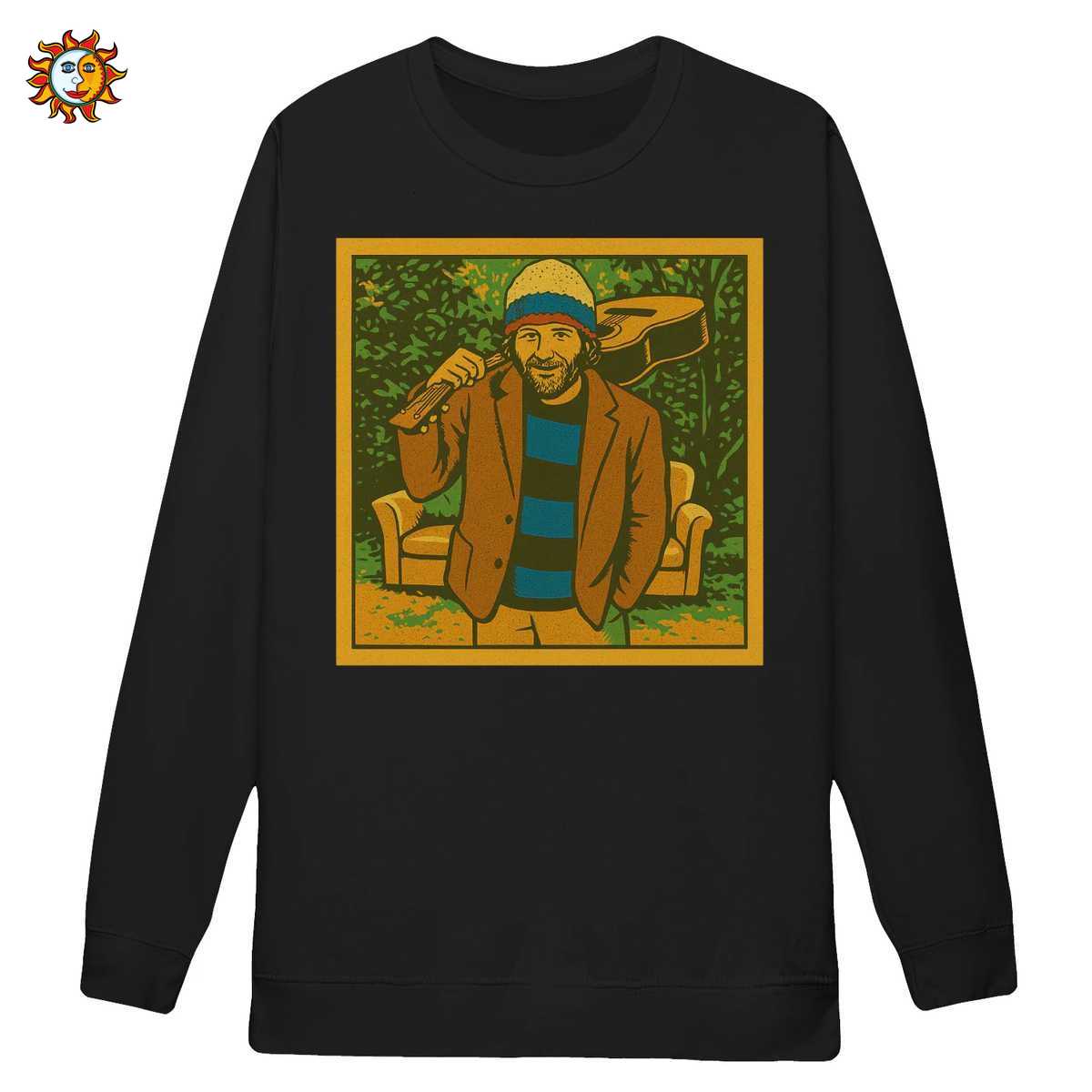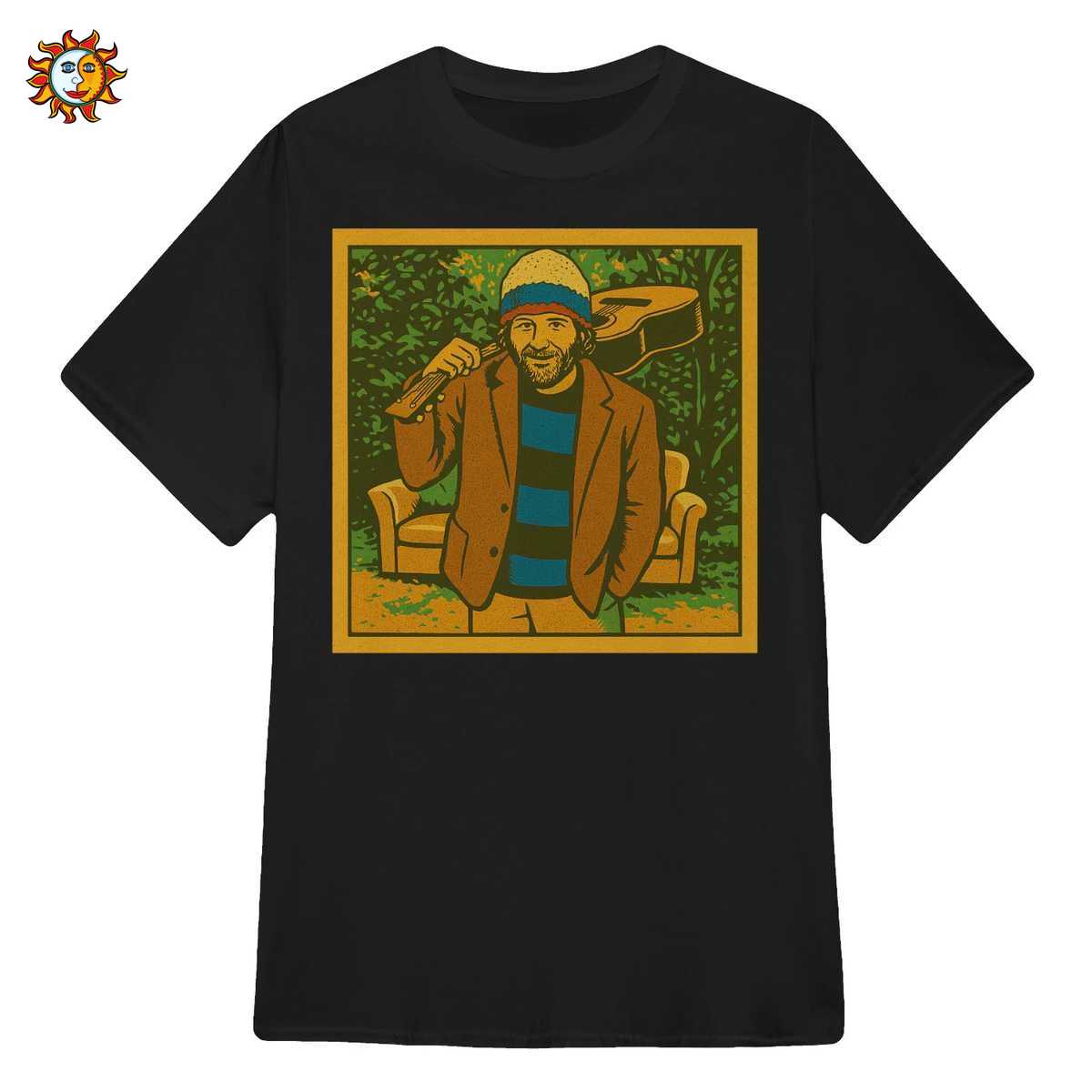 Questa t-shirt è molto più di un semplice abbigliamento per fan; è una tela che racconta una storia, quella di un’era fondamentale per la musica italiana. Il design celebra ‘Il Quinto Mondo’, l’album che nel 2002 ha consacrato Jovanotti come un cantautore globale, capace di mescolare pop italiano, world music e un profondo lirismo. L’illustrazione cattura l’anima di quel progetto artistico con uno stile unico e ricco di dettagli. Al centro della scena troviamo un giovane Lorenzo Cherubini, sorridente e sereno, che indossa il suo inconfondibile berretto colorato. La chitarra acustica in spalla non è solo uno strumento, ma il simbolo del suo ruolo di storyteller e musicista. L’elemento più surreale e significativo è il divano, posizionato in un paesaggio naturale e aperto. Questa immagine evoca perfettamente il concetto del “quinto mondo”: uno spazio personale, intimo e creativo che si può costruire ovunque, un rifugio dell’anima che trascende i confini geografici. La palette di colori caldi, dominata da giallo ocra, marrone e verde, amplifica l’atmosfera organica e positiva dell’opera.
