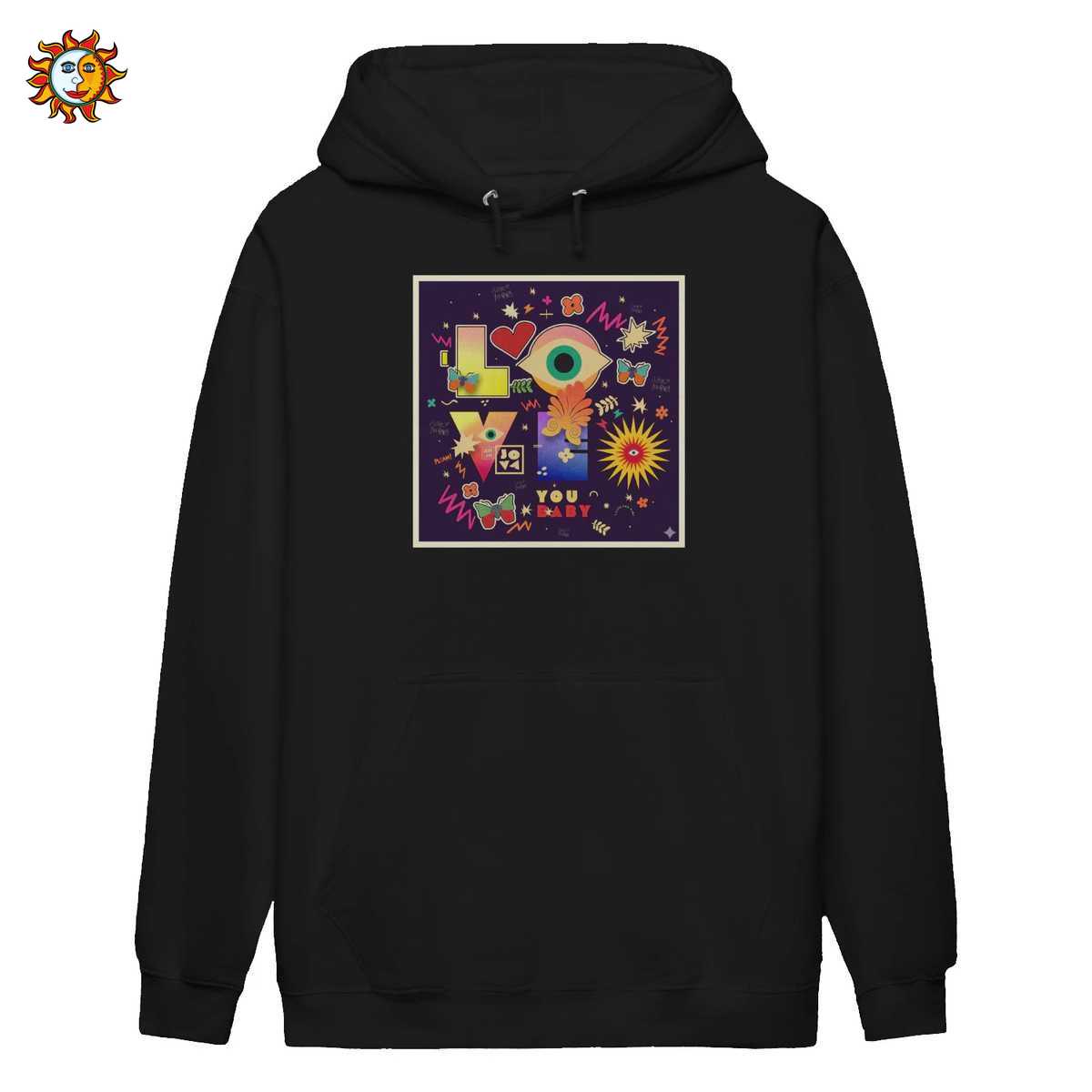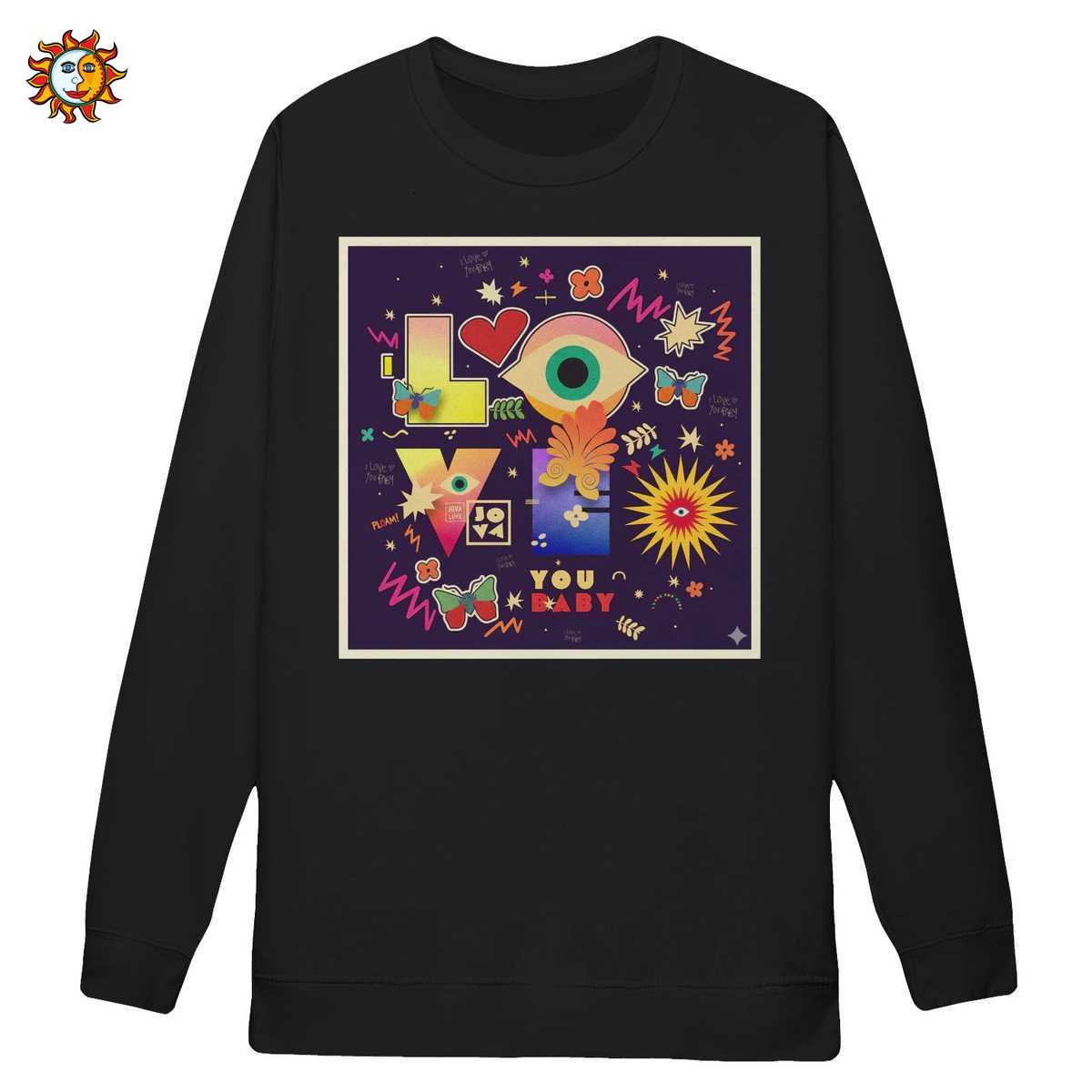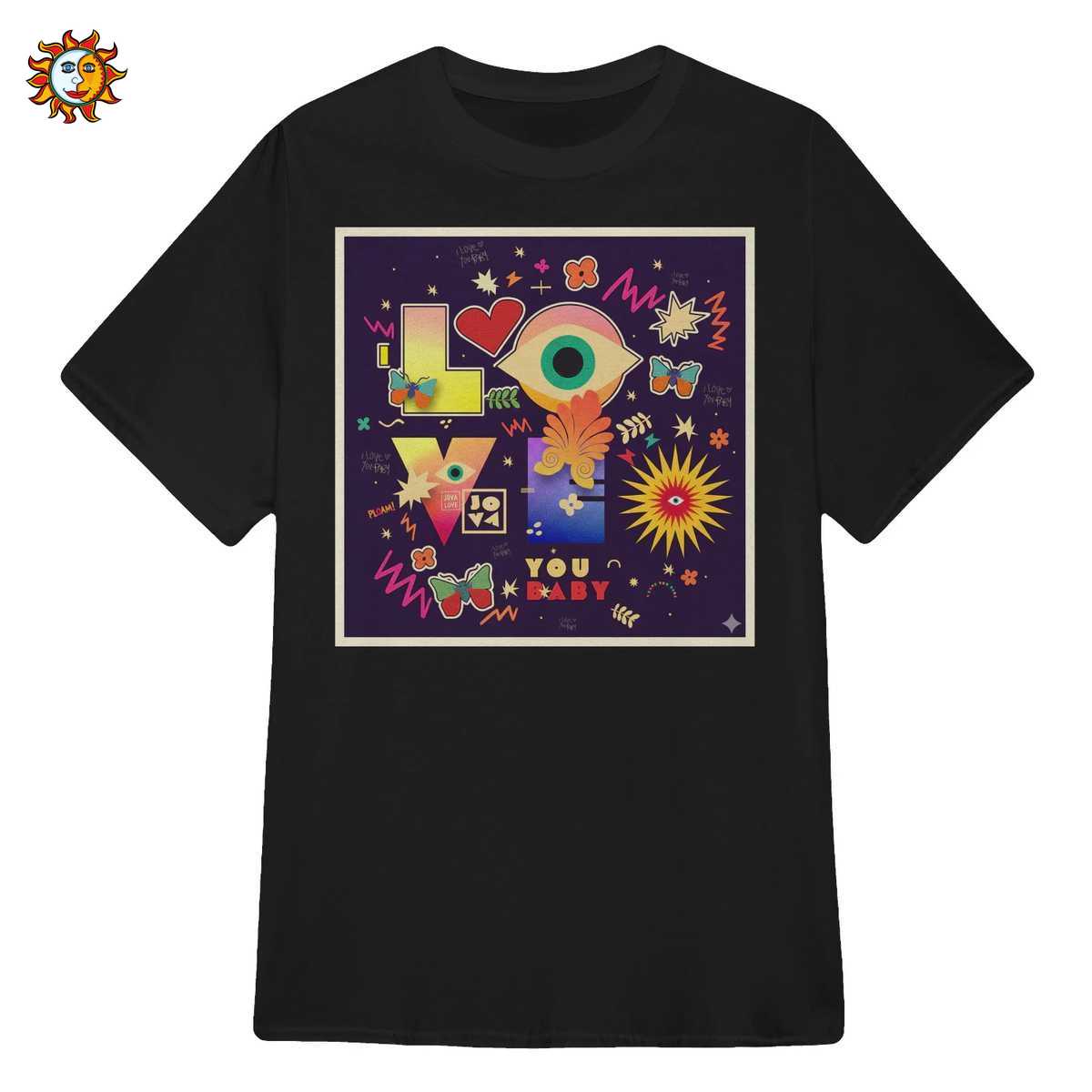 Questa non è una semplice t-shirt grafica, ma un vero e proprio manifesto artistico. Ispirata direttamente alla celebre canzone di Lorenzo Cherubini, ‘I love you baby’, la grafica è un omaggio all’immaginario visivo degli anni ’70 e ’80. Su uno sfondo viola scuro, emerge una composizione dinamica e ricca di simboli. Colori primari come il giallo, il rosso e il blu si mescolano in un tripudio cromatico che cattura immediatamente lo sguardo. Al centro della scena troviamo la parola ‘LOVE’, un grande occhio che osserva con curiosità, un sole radiante che emana energia positiva, cuori, farfalle e altri elementi psichedelici che fluttuano nello spazio. È una maglietta pensata per chi non ha paura di esprimere la propria personalità e il proprio amore per la musica italiana.